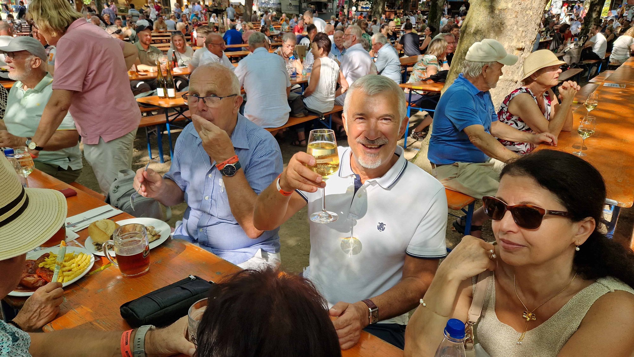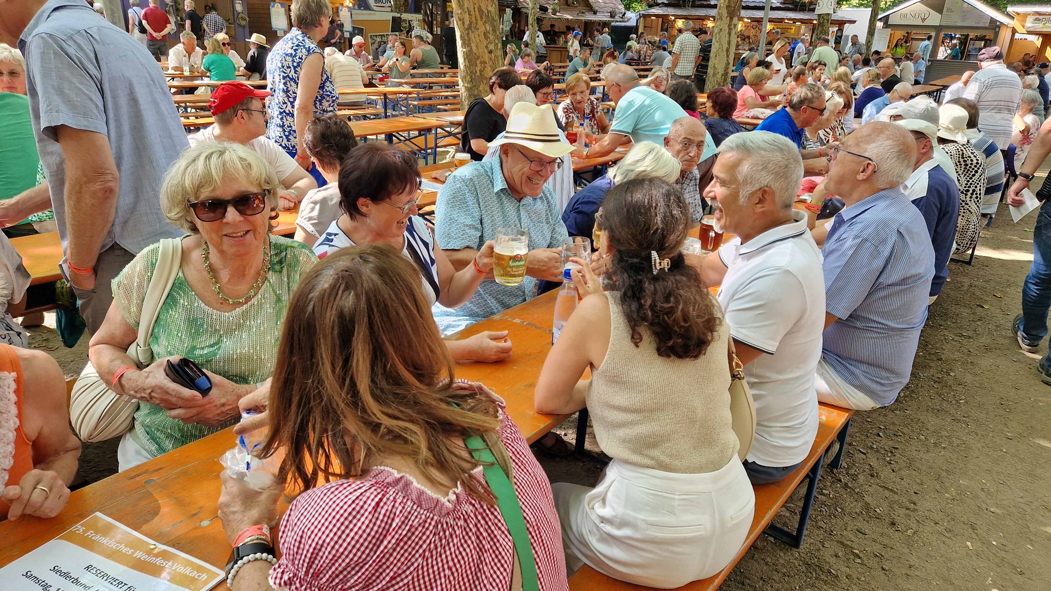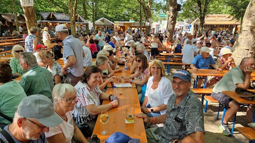 Auf gings zum gemeinsamen Ausflug der beiden Vereine zum 75. Weinfest in das schöne kleine Städtchen Volkach an der Mainschleife. Unter schattigen Bäumen wurden ca. 60 verschiedene Weine aus der Region rund um Volkach angeboten. Dazu gab es fränkische Spezialitäten zum Genießen. Nach entspannter Busfahrt wurden wir gleich von unserem ehemaligen Neutraublinger "Franz Lang" begrüßt. Er lebt seit ca. 30 Jahren mit seiner Familie in der Heimat seiner Frau und ist seit 5 Jahren auch "Volkacher Ratsherr". Seine Aufgabe ist es die vielen Gäste aus nah und fern zu begrüßen, die Weinkönigin, Weinprinzessinnen und alle teilnehmenden Winzer, deren Weine man genießen kann vorzustellen und durch die verschiedenen Programme die rund um das Weinfest stattfindet zu führen. Das Weinfest dauert 5 Tage und findet immer Mitte August statt.