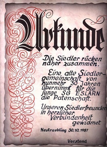 Im Beisein des damaligen Bezirks- und heutigen Landesvorsitzenden Otto Benner, des Bundestagsabgeordneten Benno Zierer sowie des 1. Bürgermeisters Roth und 1. Vorsitzenden Konrad Härtl mit einer Abordnung aus Eslarn, gründete unsere SG auf der Jahresabschlussfeier am 30. Oktober 1987 eine Patenschaft mit SG-Eslarn. Urkunde und Geschenke wurden ausgetauscht. Vorgesehen waren gegenseitige Besuche bei Veranstaltungen, Erfahrungsaustausch und Zusammenarbeit auf Vorstandsebene. Dank der Initiative unseres Vorsitzenden O. Noffke wurden die Kontakte zu unserem Patenverein in Eslarn mit ihrem Vorsitzenden Konrad Härtl wieder stärker aktiviert.